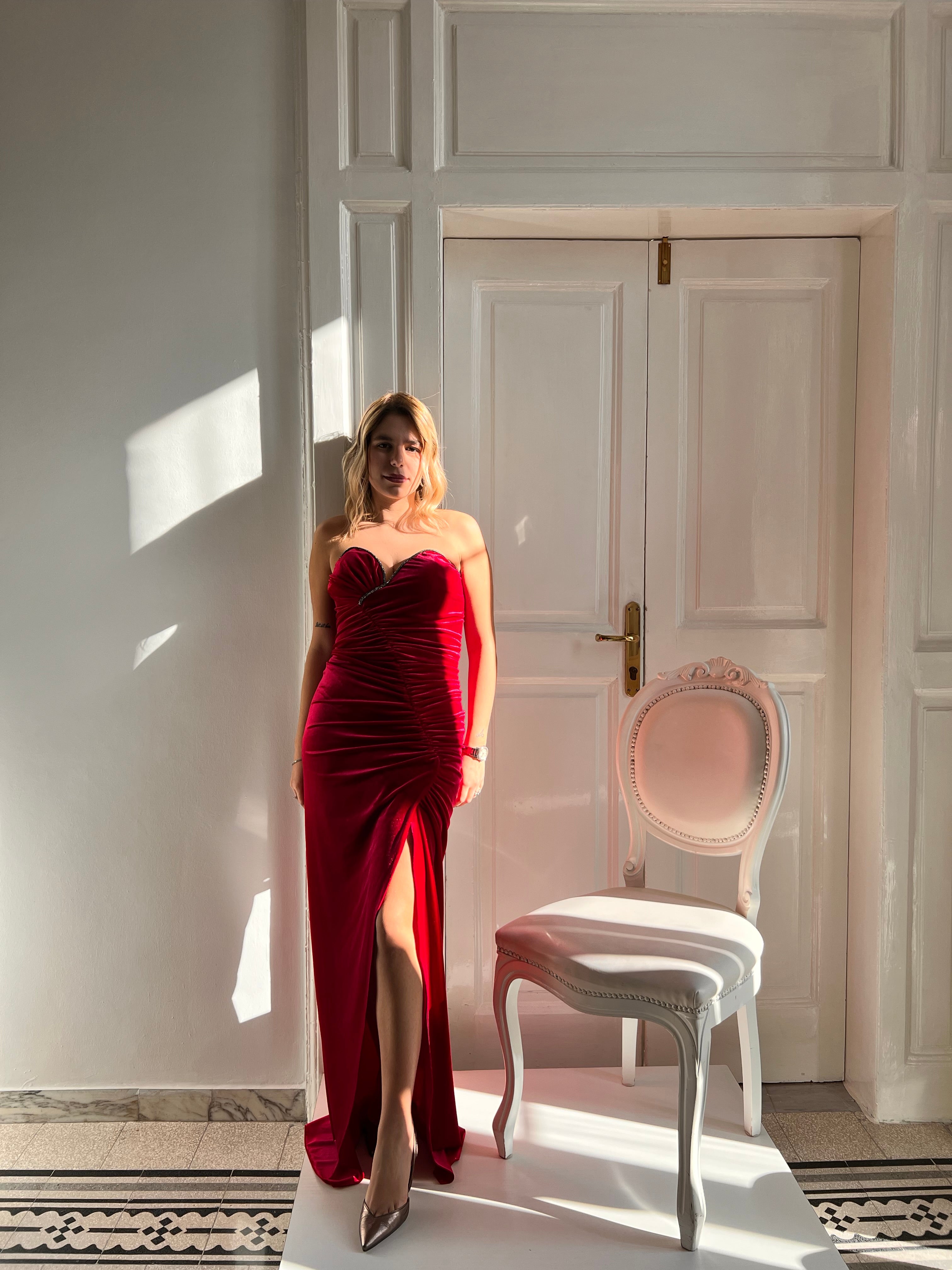 Abito lungo con spacco laterale color blu navy con dettagli preziosi