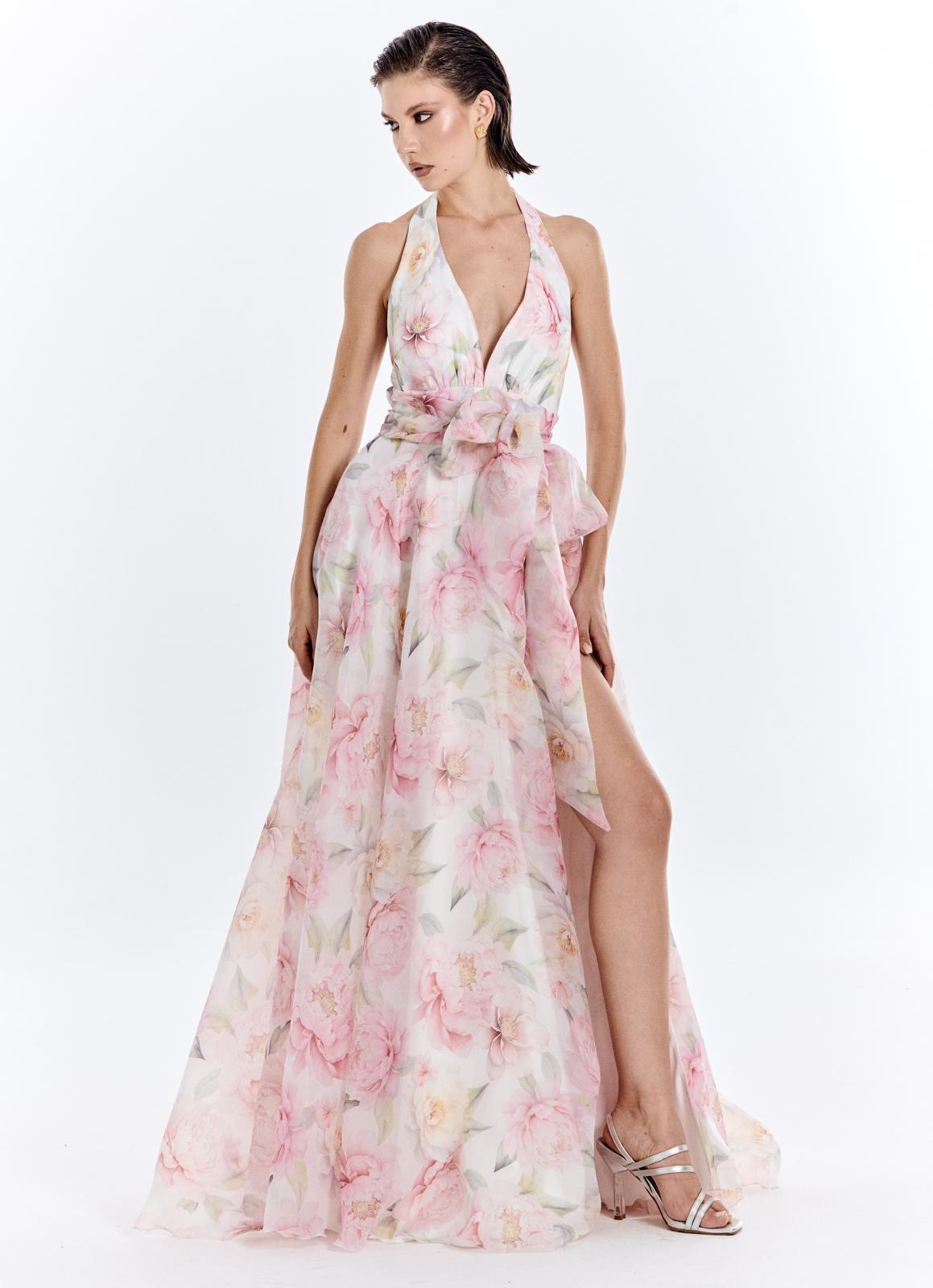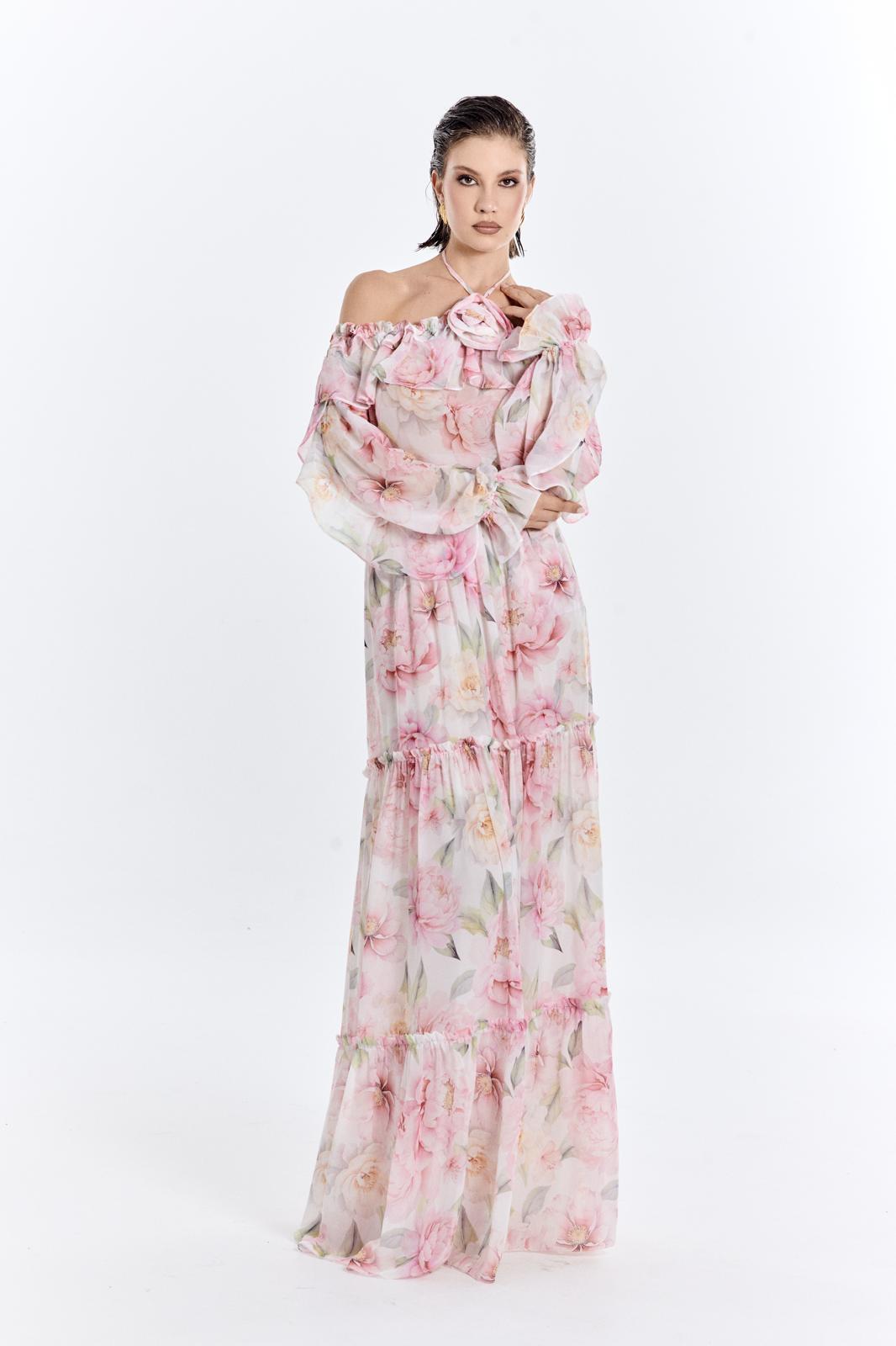 Completo due pezzi stampa floreale gonna ampia arricciata e top con maniche e scollo all’americana