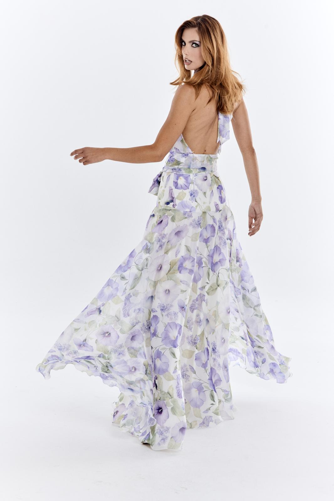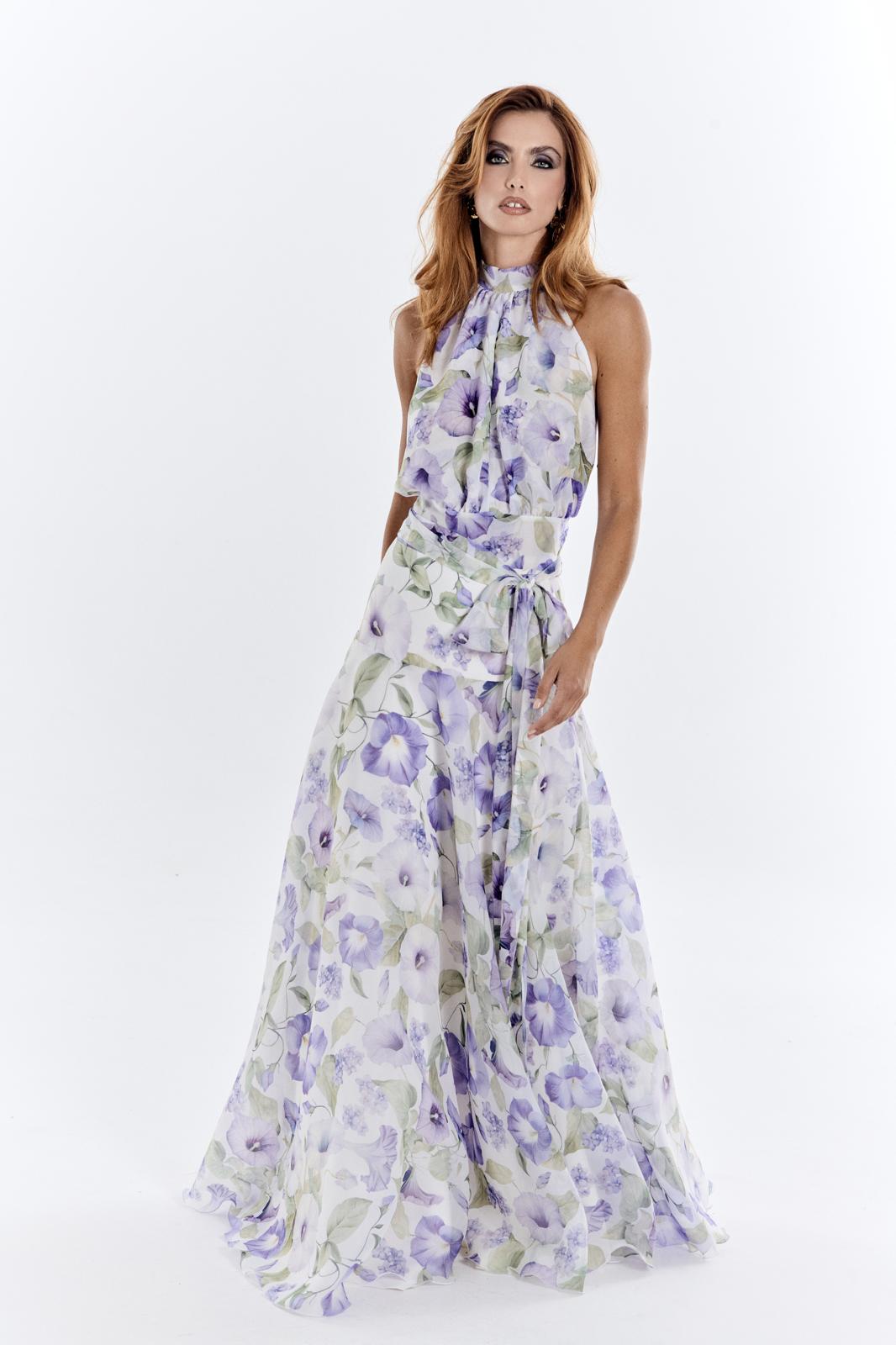 Completo due pezzi stampa floreale top scollo all’americana e gonna ampia