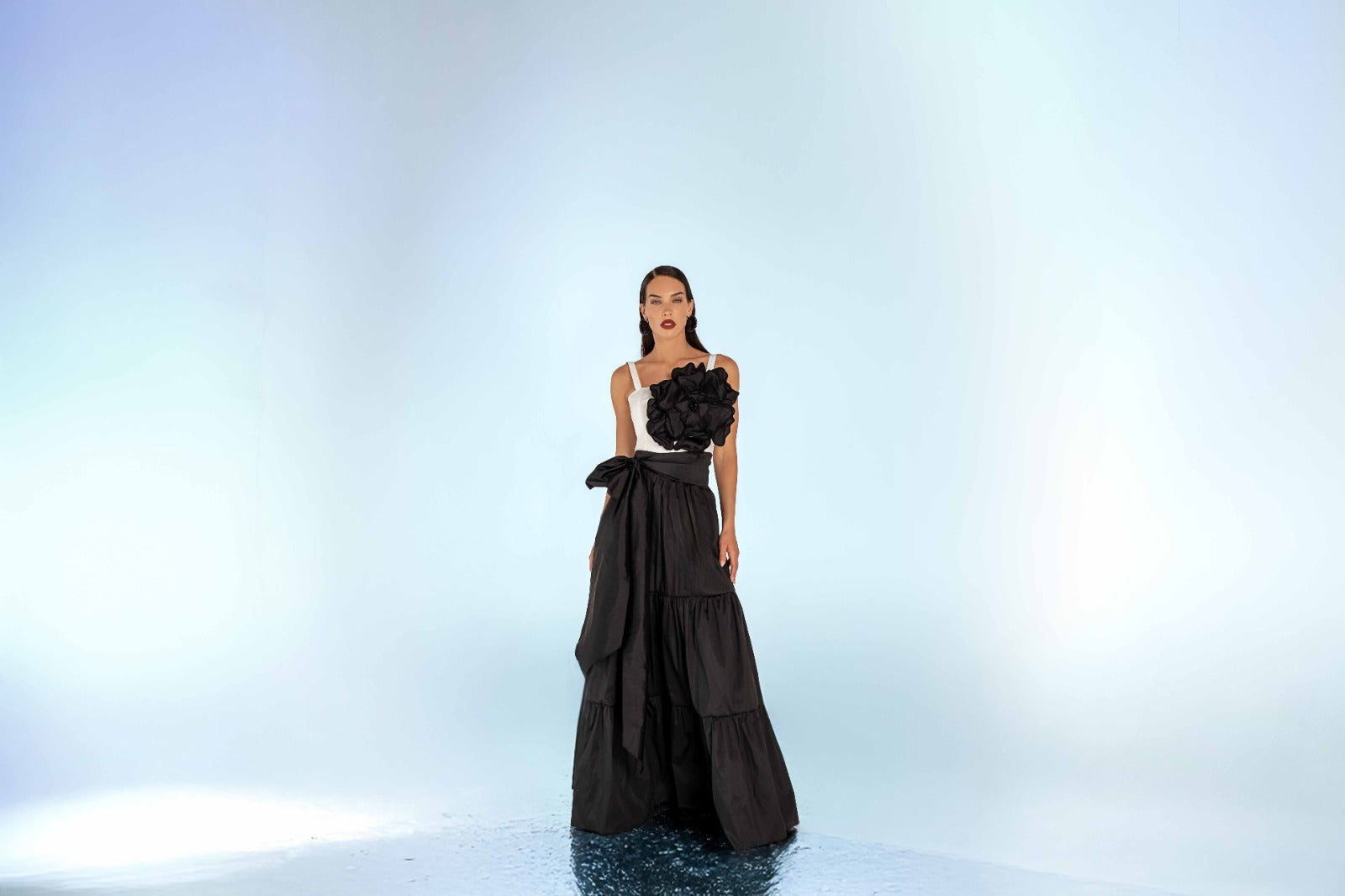 Due pezzi, top bianco taffeta con fiore, gonna taffeta nera
