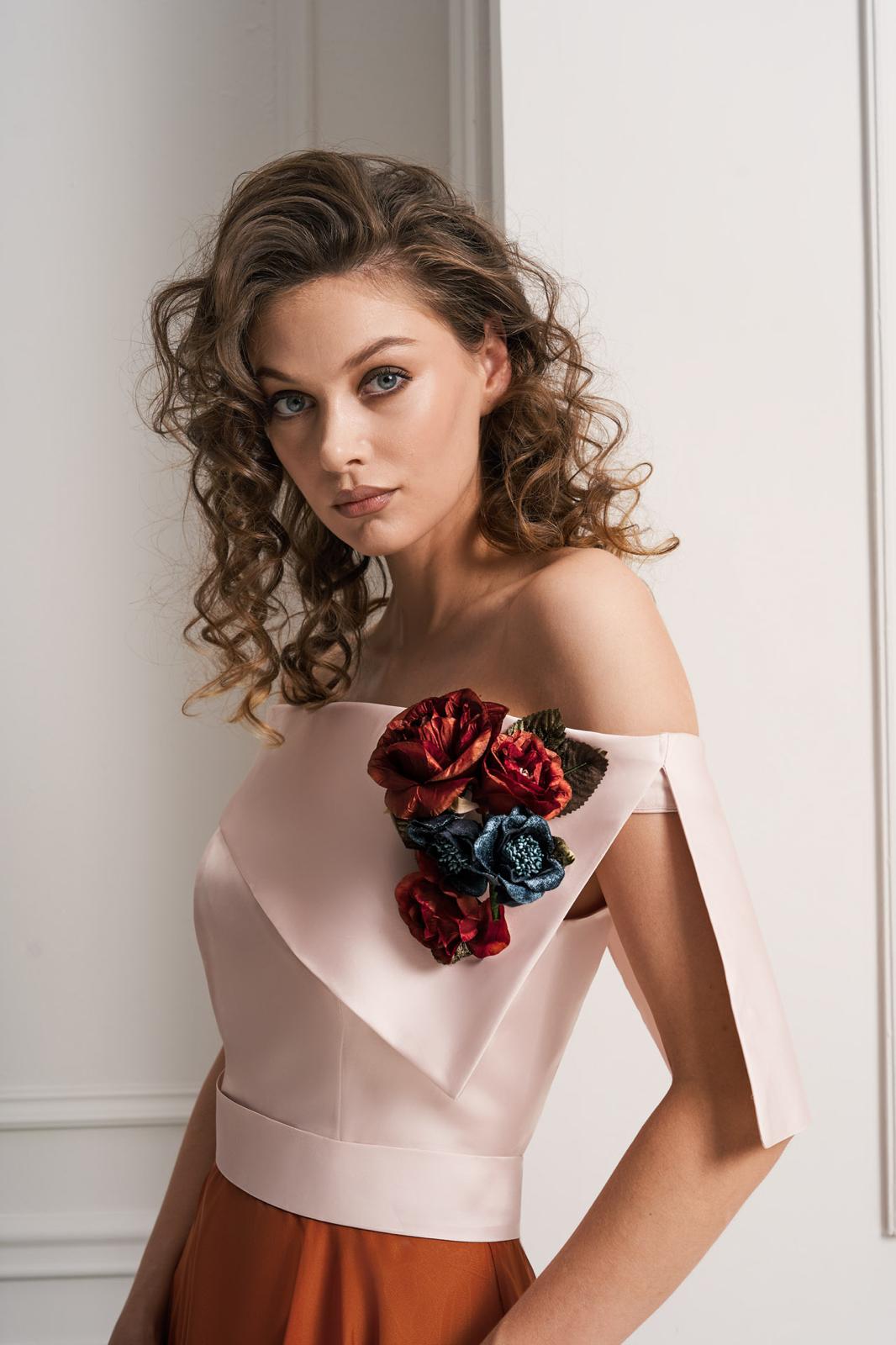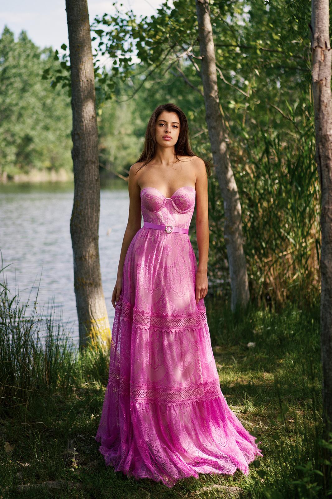 Abito scollo a cuore in pizzo fucsia con cinta gioiello