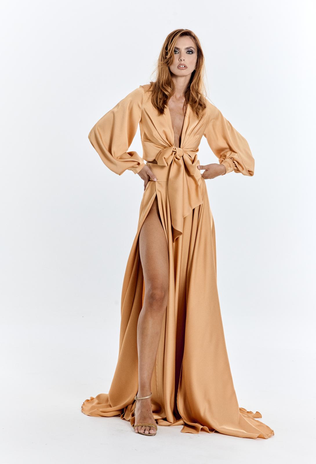 Completo due pezzi camicia e gonna con spacchi, color miele