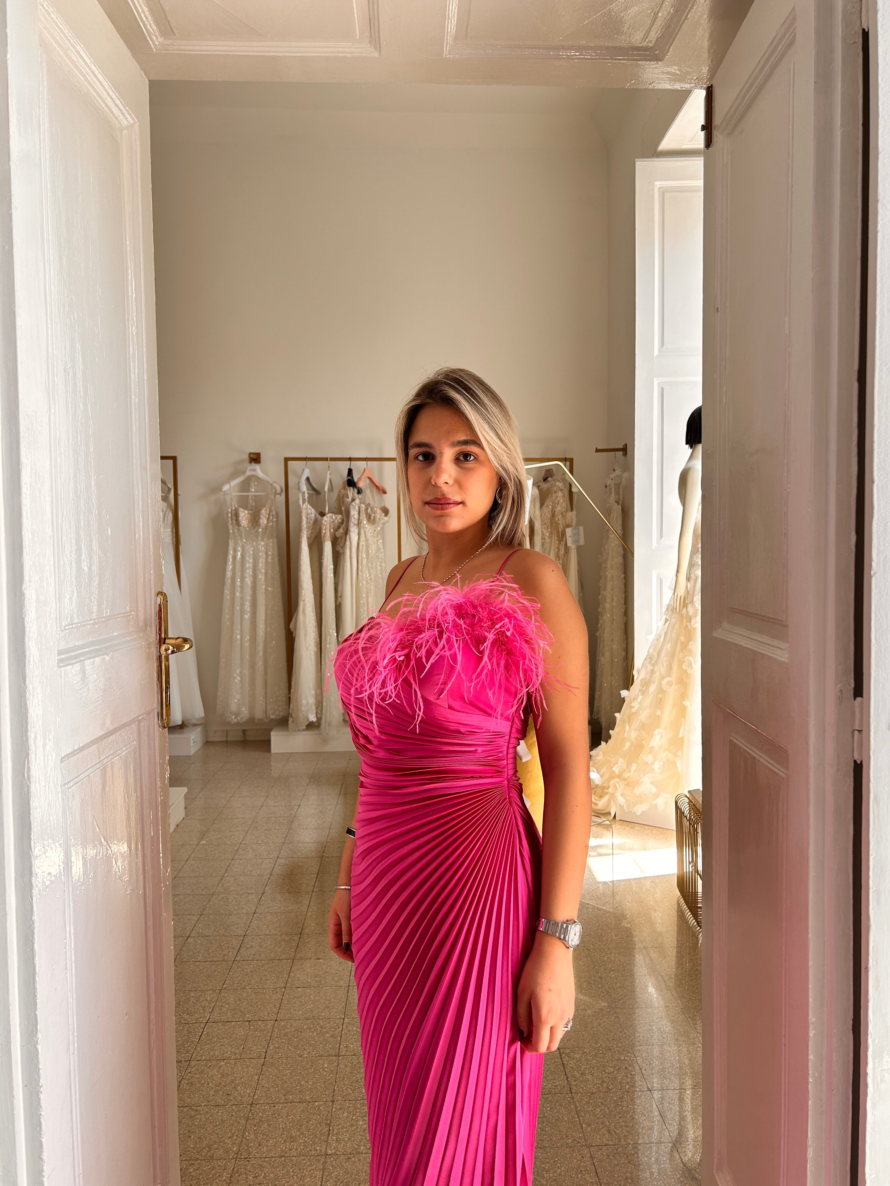 Abito in chiffon con plissè corto avanti e lungo dietro
